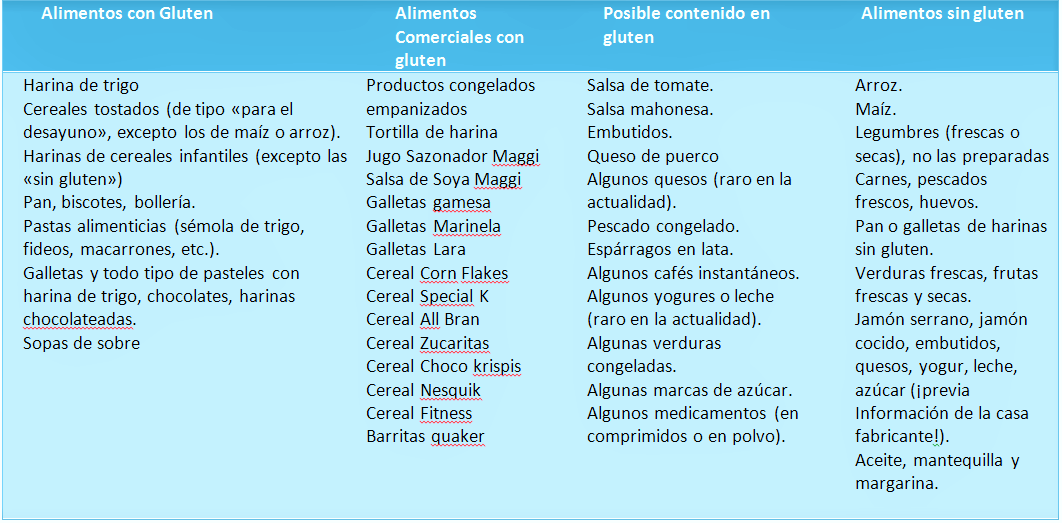 Las persona con esta enfermedad no toleran los derivados de trigo, avena, cebada y centeno, por lo tanto sus porciones de cereales están basados en maíz, arroz y derivados de estos.